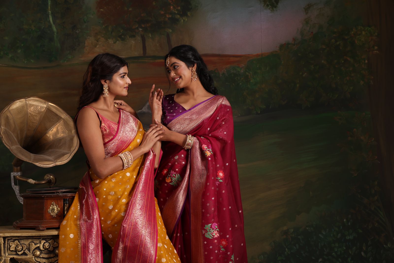 Red - Mustard Yellow Banarasi Kora Silk Saree With Zari Butta Floral Motifi